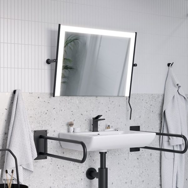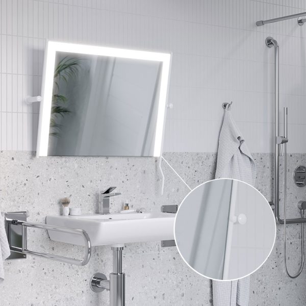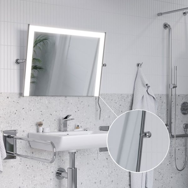 Der Med Solaris LED neigbare Badezimmerspiegel aus der Med Line Kollektion von RUKE ist ein Modell, das für den Komfort von Menschen mit Behinderungen entwickelt wurde. Dank des passenden Designs und des bequemen Griffs kann die Einstellung an die individuellen Bedürfnisse von Personen mit Mobilitäts- oder Motilitätsproblemen der oberen Gliedmaßen angepasst werden. Der Med LED-Neigungsspiegel Solaris von RUKE wurde aus Stahlelementen und einem hochwertigen Spiegelpaneel gefertigt.