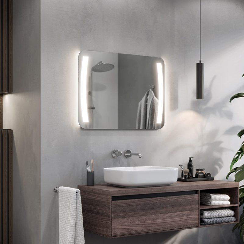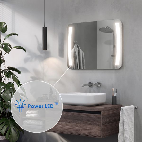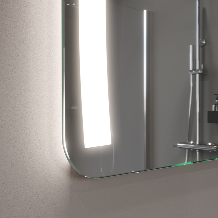 LED-Spiegel werden hergestellt, indem die Rückseite des Spiegels an den entsprechenden Stellen sandgestrahlt wird, d. h. seine Spiegelbeschichtung wird mithilfe eines speziellen feinen Sandes abgetragen. Die dadurch entstehenden milchigen und durchscheinenden Bereiche sind lichtdurchlässig. Durch die Verwendung der leistungsstärksten auf dem Markt erhältlichen LEDs und ein innovatives Installationsdesign konnten wir die maximale Lichtmenge auf die vorgesehenen Bereiche konzentrieren und sie im Vergleich zu herkömmlichen LED-beleuchteten Spiegeln um mehr als 100% verstärken. Folglich blendet unsere Beleuchtung nicht, sondern ist ideal für den täglichen Gebrauch (z. B. beim Schminken, Rasieren usw.).