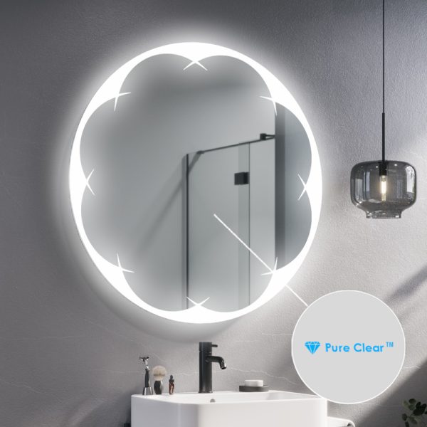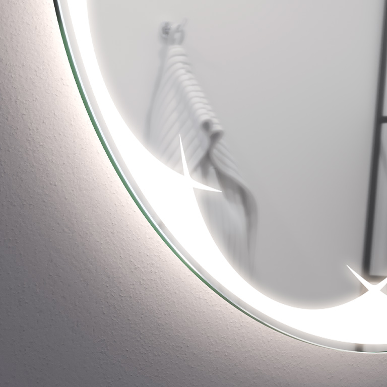 Ein Spiegel, der eine sehr hohe Beständigkeit gegen periphere und punktuelle Korrosion bietet. Darüber hinaus wird er mit Rücksicht auf unseren Planeten und die Menschen hergestellt. Dank eines hochmodernen Herstellungsverfahrens ist er frei von Blei und organischen Lösungsmitteln, und seine Unterbeleuchtung eliminiert den Effekt der Überbelichtung bei der Verwendung von LED-Streifen.