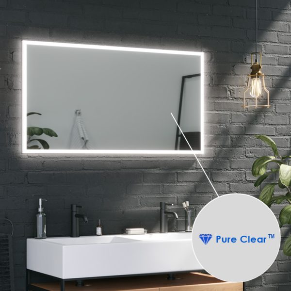 Pure Clear™ ist ein Spiegel, der eine sehr hohe Beständigkeit gegen Kanten- und Punktkorrosion aufweist. Außerdem wurde er mit Rücksicht auf den Planeten und die Menschen hergestellt. Dank eines hochmodernen Herstellungsverfahrens ist er frei von Blei und organischen Lösungsmitteln, und seine Unterbeleuchtung verhindert den Effekt der Überbeleuchtung bei Verwendung von LED-Streifen.