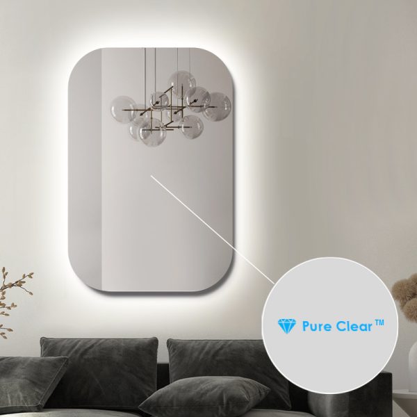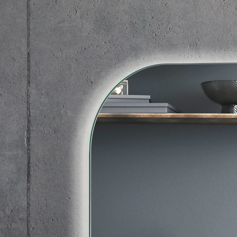 Pure Clear™ ist ein Spiegel, der eine sehr hohe Beständigkeit gegen Kanten- und Punktkorrosion aufweist. Darüber hinaus wurde er mit Respekt für unseren Planeten und die Menschen hergestellt. Dank eines hochmodernen Herstellungsprozesses ist er frei von Blei und organischen Lösungsmitteln, und seine Unterbeleuchtung eliminiert den Effekt der Überbeleuchtung bei der Verwendung von LED-Streifen.