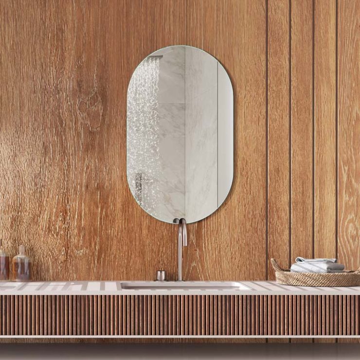 Ein Spiegel, der eine sehr hohe Beständigkeit gegen periphere und punktuelle Korrosion bietet. Darüber hinaus wird er mit Rücksicht auf unseren Planeten und die Menschen hergestellt. Dank eines hochmodernen Herstellungsverfahrens ist er frei von Blei und organischen Lösungsmitteln, und seine Unterbeleuchtung eliminiert den Effekt der Überbelichtung bei der Verwendung von LED-Streifen.
