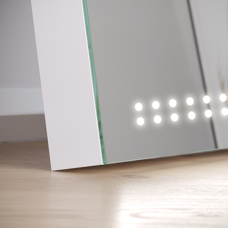 Ein berührungsempfindlicher Schalter schaltet die Beleuchtung ein und aus, indem er die Oberfläche des Panels berührt. Aus Gründen des Umweltschutzes und der Energieeinsparung schaltet sich die Beleuchtung nach 30 Minuten von selbst aus. Mit dieser Lösung werden Sie nie wieder vergessen, Ihren Spiegel auszuschalten.