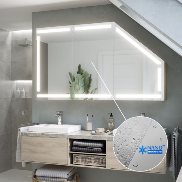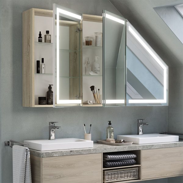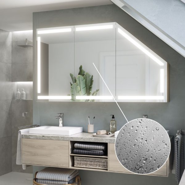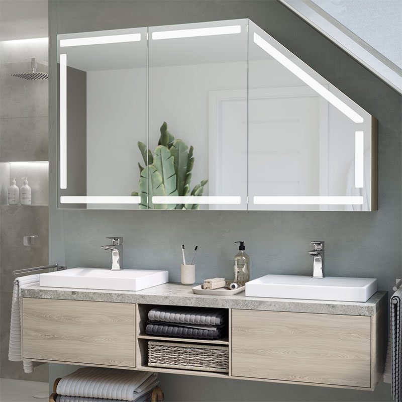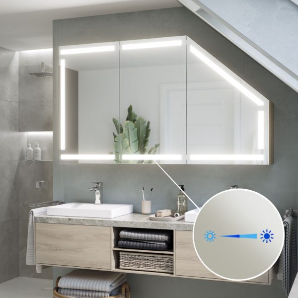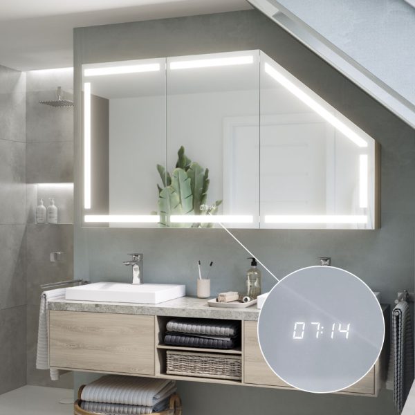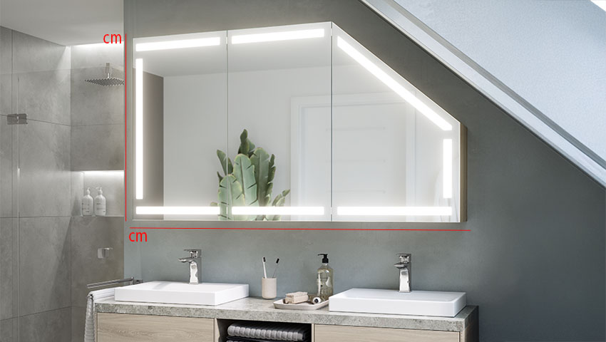 A modern and functional cabinet ideal for bathrooms, including rooms with sloping surfaces. Equipped with LED lighting, it offers practical storage space and a minimalist design that fits into a variety of environments.
