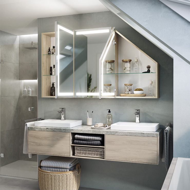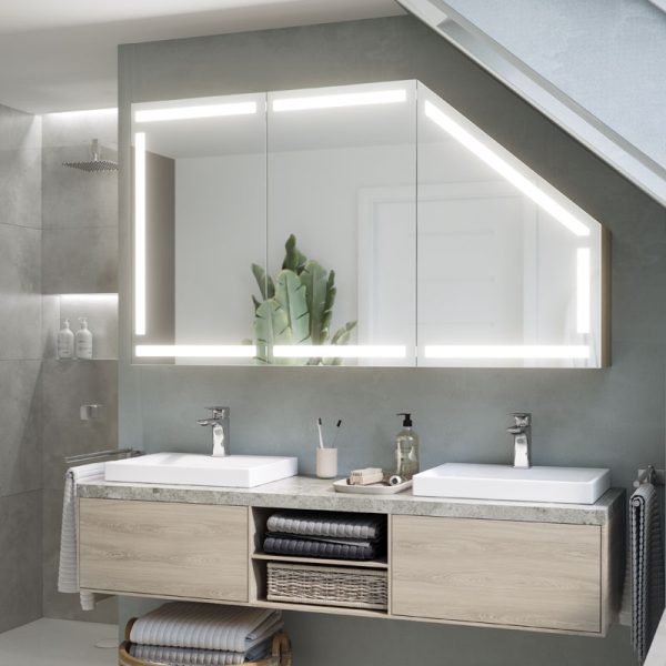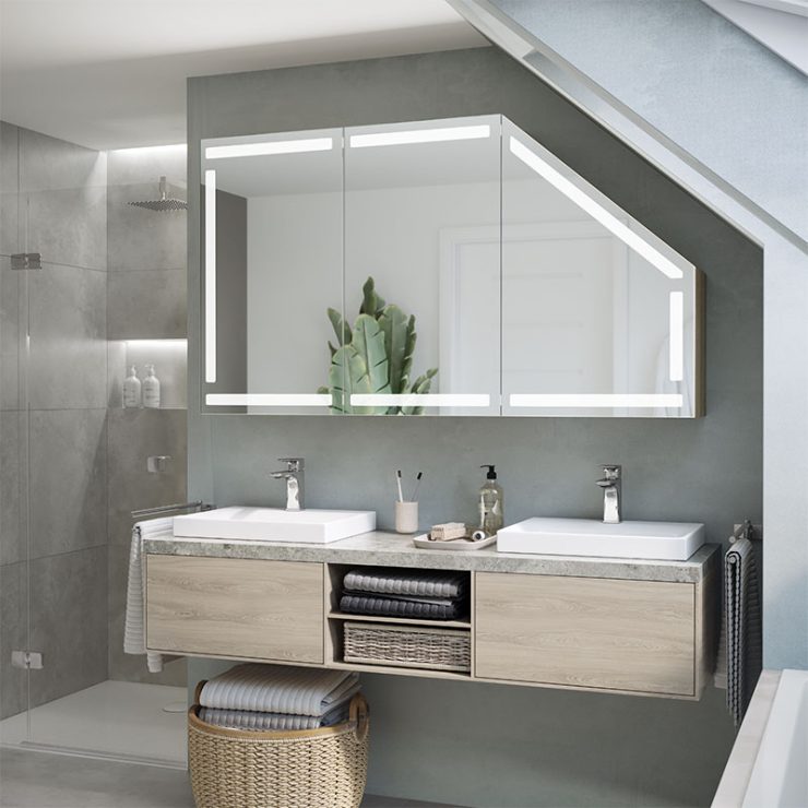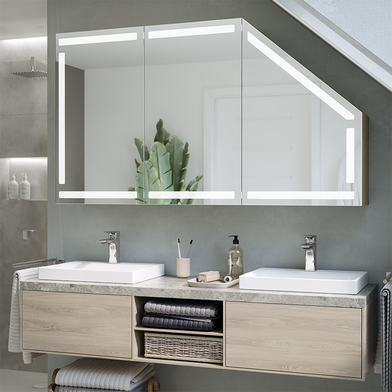 A modern LED cabinet tailored to a sloping wall in the bathroom is a solution for effectively partitioning difficult loft spaces.