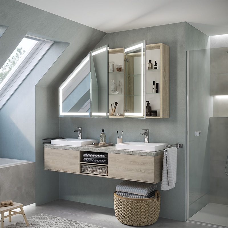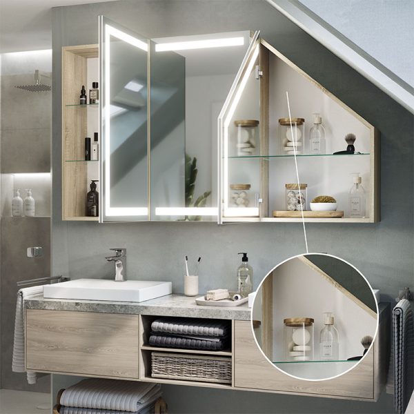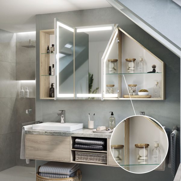 Ontario Multi is a bathroom cabinet made with demanding spaces in mind, such as areas with sloping ceilings. Thanks to its smart design and modern solutions, such as LED lighting, it fits perfectly in any bathroom.