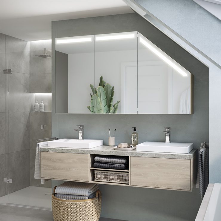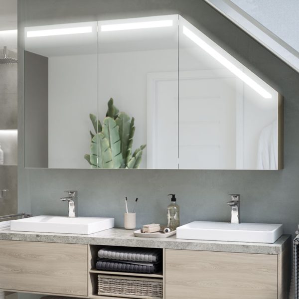 A modern LED cabinet tailored to a sloping wall in the bathroom is a solution for effectively partitioning difficult loft spaces.