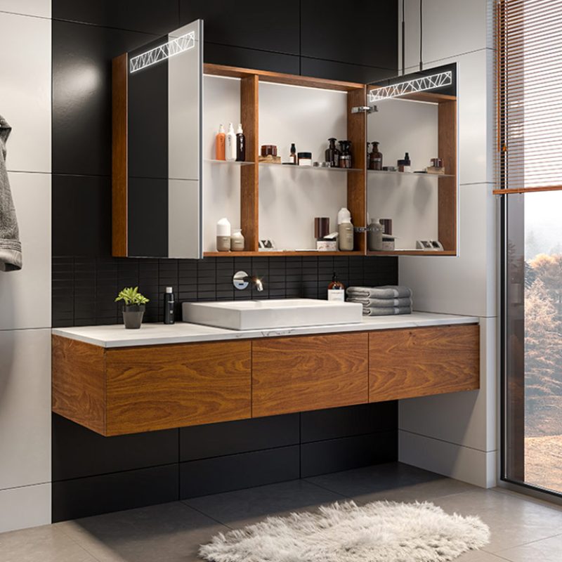 The bathroom mirror with cabinet with LED lighting is an extremely practical piece of bathroom equipment. It combines the functionality of a piece of furniture and a mirror, allowing you to store your cosmetics and other small items, as well as perform your daily beauty routines. The mirror front replaces the traditional mirror, so that the space above the washbasin is well utilised. Modern and energy-efficient LED lighting is an asset, thanks to which this piece of furniture illuminates the bathroom, creating a cosy atmosphere. The high quality and aesthetics of workmanship mean that the RUKE bathroom mirror cabinet will allow you to create an original arrangement.