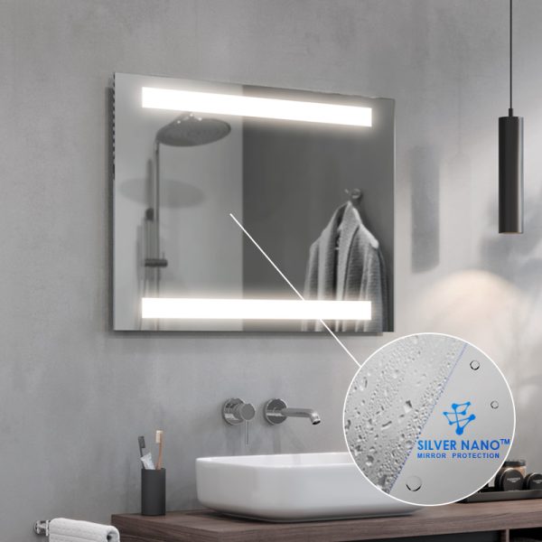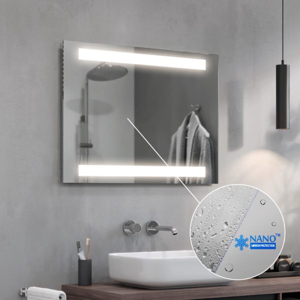 LED mirrors are achieved by sandblasting the back side of the mirror in suitable places, i.e. stripping off its mirror coating with a specialised fine sand. The resulting milky, translucent areas transmit light. Thanks to the use of the most powerful leds available on the market and an innovative installation design, we were able to focus the maximum amount of light in the designated areas and amplify them by more than 100% compared to ordinary led backlit mirrors. As a result, our illumination does not dazzle, but is ideal for everyday use (e.g. when applying make-up, shaving, etc.).