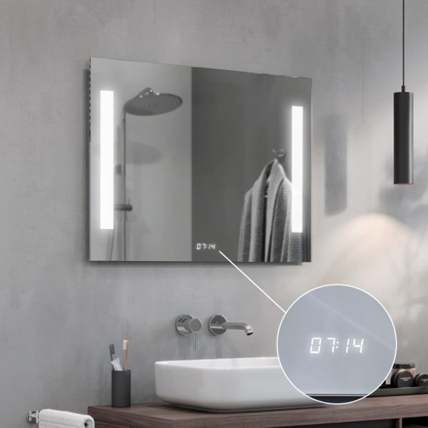 Digital LED clock in white with the possibility of mounting almost anywhere on the mirror, display size 2x5cm. The clock displays the time with the mirror switch option or when the main light is switched on if the mirror does not have a switch.