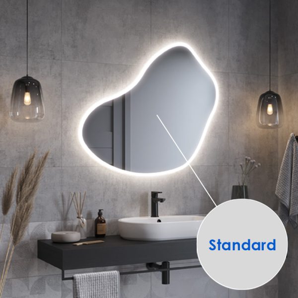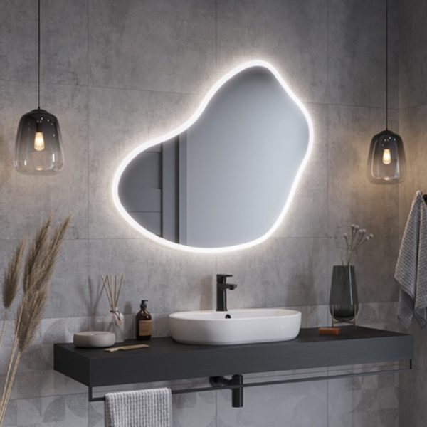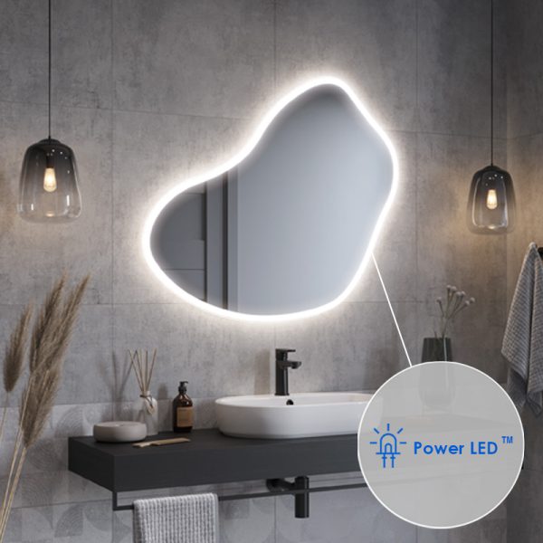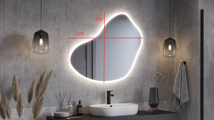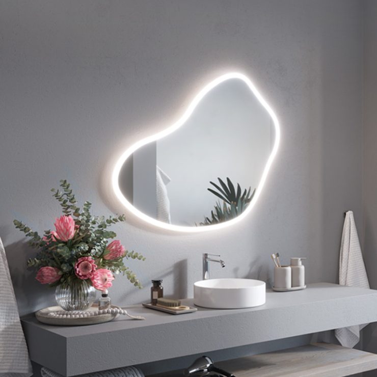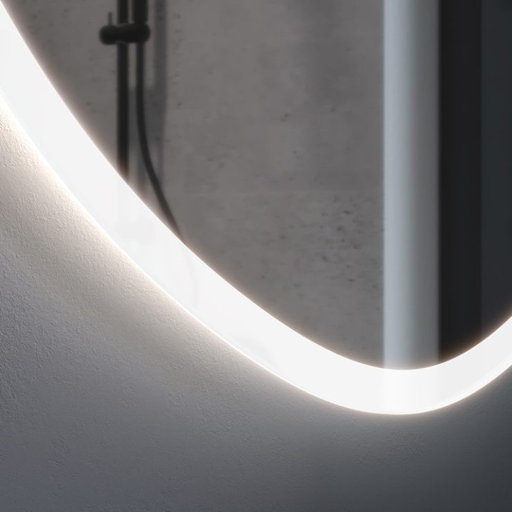 The Grano LED Slim illuminated mirror is made to individual order. It is up to you to decide from which side and at what distance from the edge the vertical cut is to be made. This makes it easy for you to compose your own arrangement. You will make maximum use of the available space – the mirror will fit perfectly against the wall. The unusual shape makes the mirror stand out from its surroundings and focuses the energy of the interior.