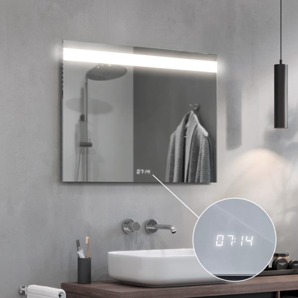 Digital LED clock in white with the possibility of mounting almost anywhere on the mirror, display size 2x5cm. The clock displays the time with the mirror switch option or when the main light is switched on if the mirror does not have a switch.