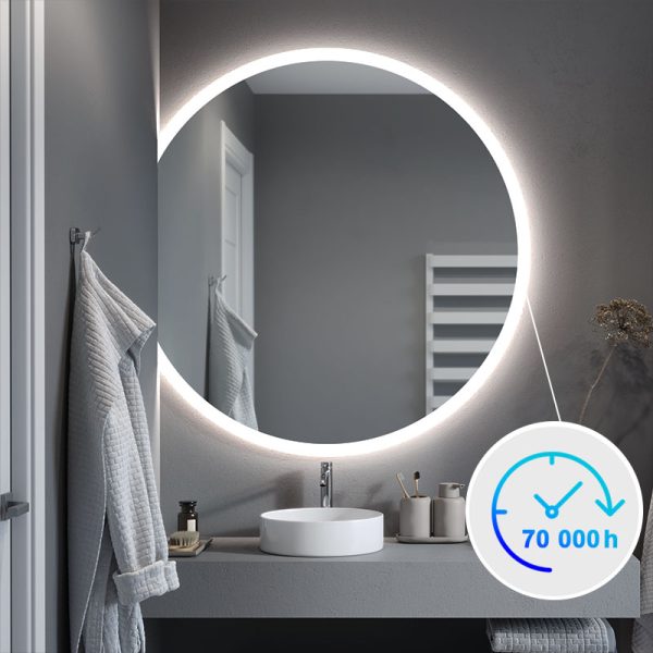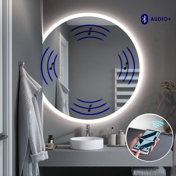 The advantage of the LED bathroom mirror is the ambient lighting that provides the room with a slight twilight giving an intimate and relaxing atmosphere. Also select practical extras such as a switch with brightness regulator for changing the intensity of the lighting, a Bluetooth speaker with which to play music in the bathroom or an anti-steaming heating mat.