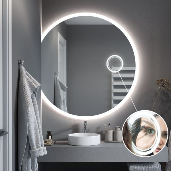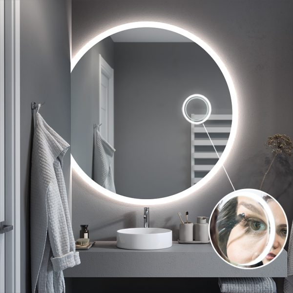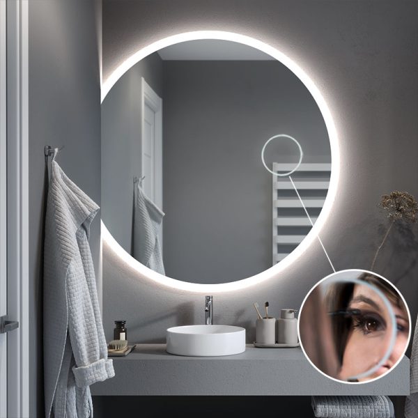 The magnifying mirror is one of the most practical pieces of bathroom equipment. The mirror has an optimum magnification of x3 and a diameter of 14 cm, with the possibility of mounting an additional LED illumination*. Smoothly integrated into the surface of the mirror, it forms a unified whole with the mirror.