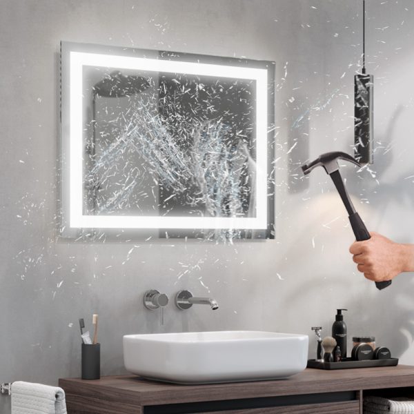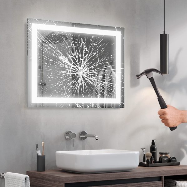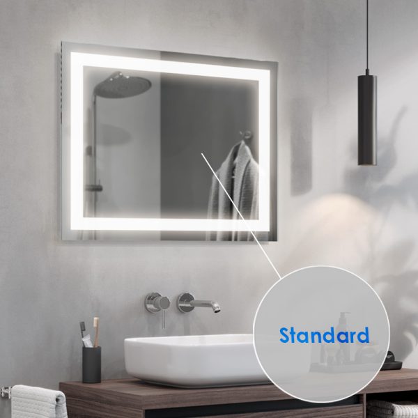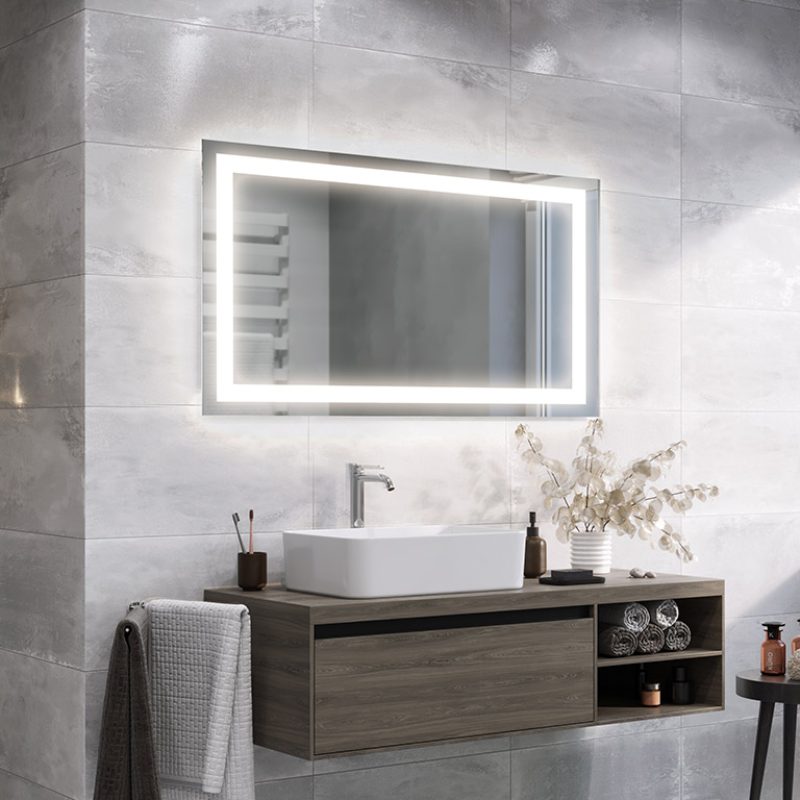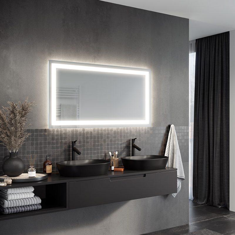 LED mirrors are achieved by sandblasting the back side of the mirror in suitable places, i.e. stripping off its mirror coating with a specialised fine sand. The resulting milky, translucent areas transmit light. Thanks to the use of the most powerful leds available on the market and an innovative installation design, we were able to focus the maximum amount of light in the designated areas and amplify them by more than 100% compared to ordinary led backlit mirrors. As a result, our illumination does not dazzle, but is ideal for everyday use (e.g. when applying make-up, shaving, etc.).