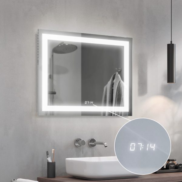 Digital Led clock in white with the possibility of mounting almost anywhere on the mirror, display size 2x5cm. The clock displays the time with the mirror switch option or when the main light is switched on if the mirror does not have a switch.
