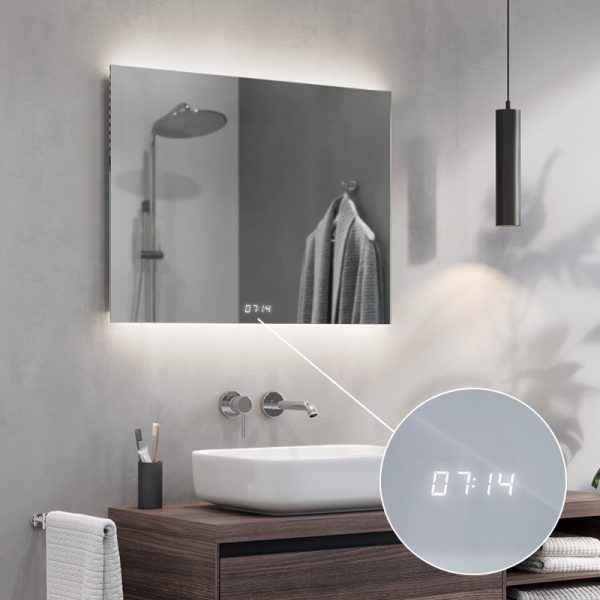 Digital LED clock in white with the possibility of mounting almost anywhere on the mirror, display size 2x5cm. The clock displays the time with the mirror switch option or when the main light is switched on if the mirror does not have a switch.