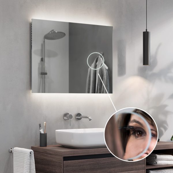 The magnifying mirror is one of the most practical pieces of bathroom equipment. The mirror has an optimum magnification of x3 or x5 and a diameter of 14cm. Smoothly integrated into the surface of the mirror, it forms a unified whole with it.
