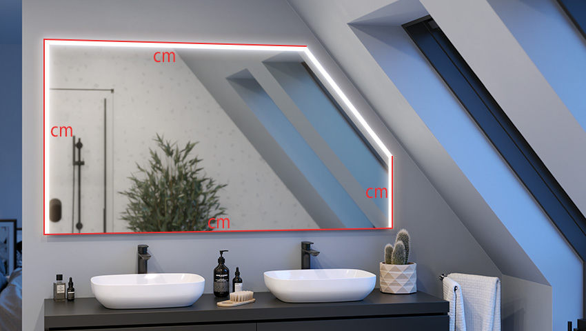Modern LED mirrors cut to the dimensions of the slanted wall in the bathroom are a solution for effectively arranging difficult attic spaces.
