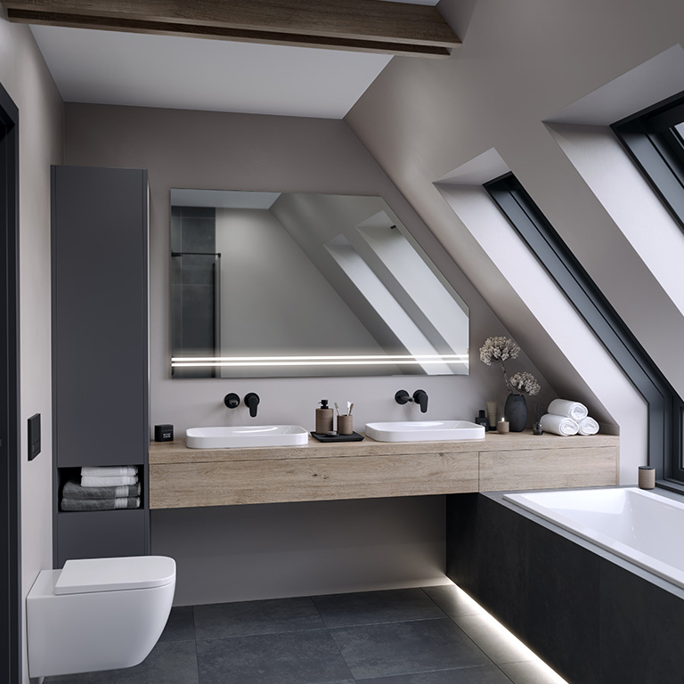 Modern LED mirrors cut to the dimensions of the slanted wall in the bathroom are a solution for effectively arranging difficult attic spaces.