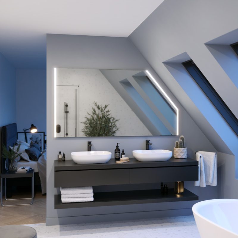Modern LED mirrors cut to the dimensions of the slanted wall in the bathroom are a solution for effectively arranging difficult attic spaces.