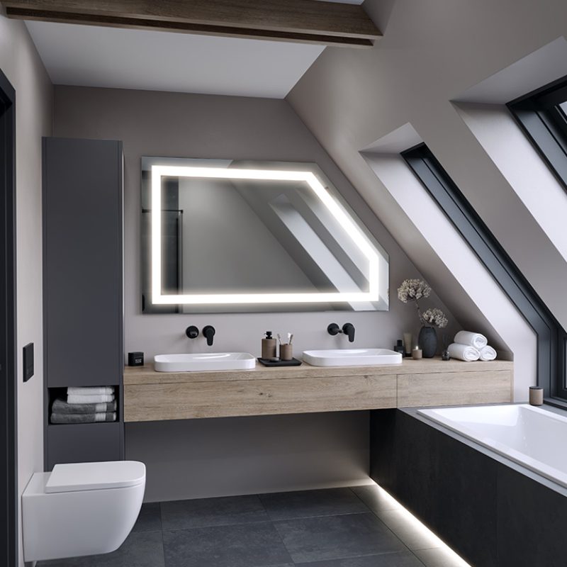 Modern LED mirrors cut to the dimensions of the slanted wall in the bathroom are a solution for effectively arranging difficult attic spaces.