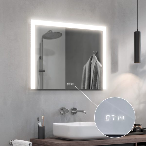 Digital Led clock in white with the possibility of mounting almost anywhere on the mirror, display size 2x5cm. The clock displays the time with the mirror switch option or when the main light is switched on if the mirror does not have a switch.