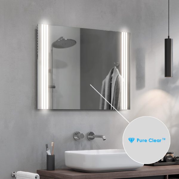 LED mirrors are achieved by sandblasting the back side of the mirror in suitable places, i.e. stripping off its mirror coating with a specialised fine sand. The resulting milky, translucent areas transmit light. Thanks to the use of the most powerful leds available on the market and an innovative installation design, we were able to focus the maximum amount of light in the designated areas and amplify them by more than 100% compared to ordinary led backlit mirrors. As a result, our illumination does not dazzle, but is ideal for everyday use (e.g. when applying make-up, shaving, etc.).