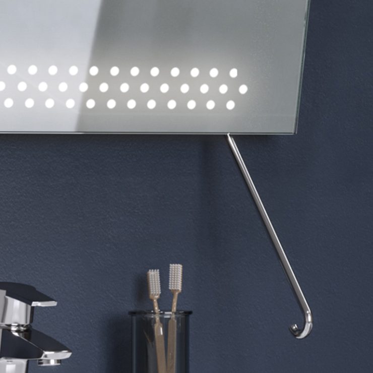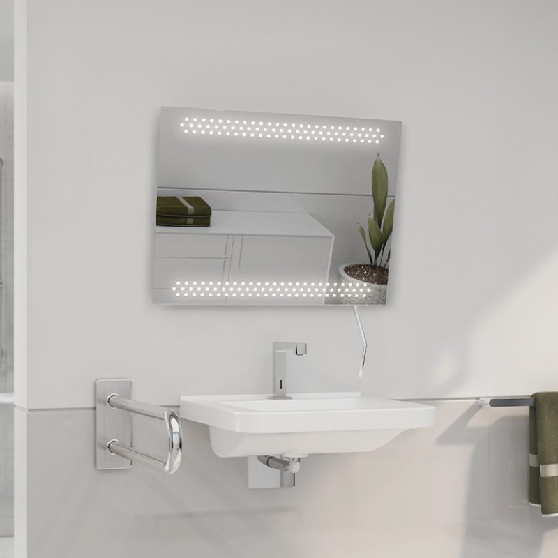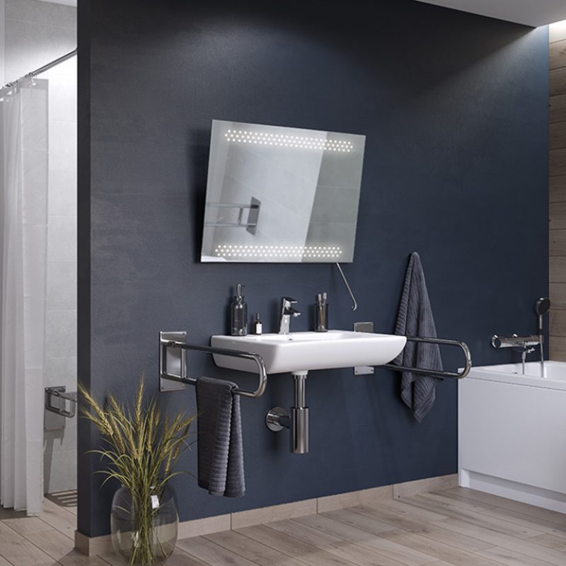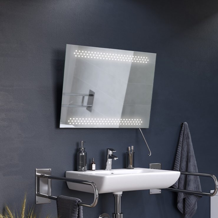 The Med Corallos LED tilt bathroom mirror from RUKE’s Med Line collection is a model designed with the comfort of people with disabilities in mind. Thanks to its suitable design and comfortable handle, it is possible to adjust the setting to individual needs by people with mobility or upper limb motor difficulties. The Med Corallos LED tilt mirror by RUKE was created with steel elements and a high-quality mirror panel.