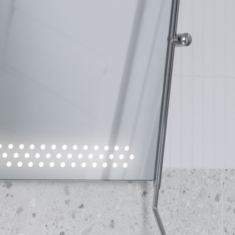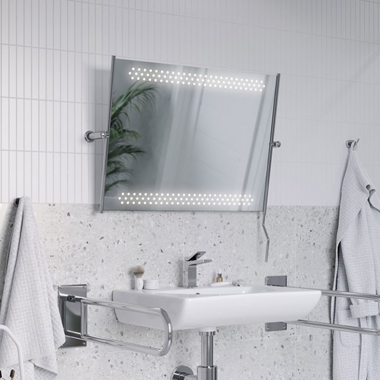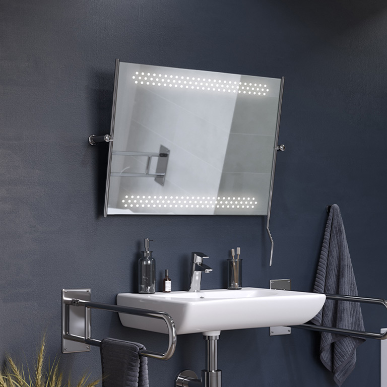 The Med ST Corallos LED tilting bathroom mirror from RUKE’s Med Line collection is a model designed with the comfort of people with disabilities in mind. Thanks to its suitable design and comfortable handle, it is possible to adjust the setting to individual needs by people with mobility or upper limb motility problems. The Med ST Corallos LED tilt mirror by RUKE was created with steel elements and a high-quality mirror panel.