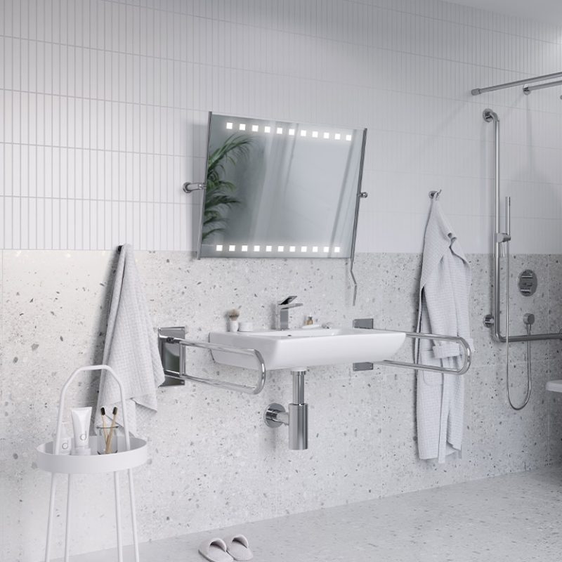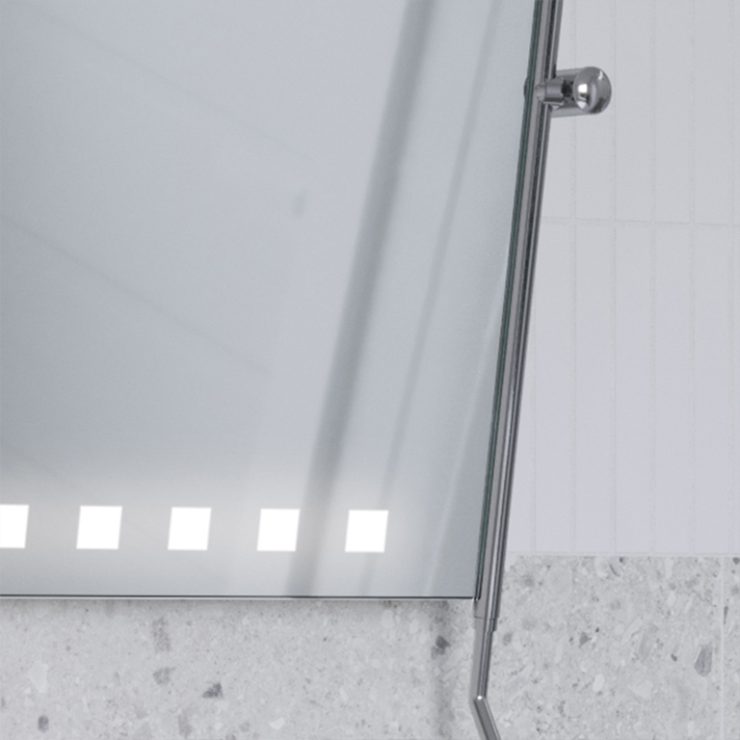 The Med ST Quadron LED tilt bathroom mirror from RUKE’s Med Line collection is a model designed with the comfort of people with disabilities in mind. Thanks to its suitable design and comfortable handle, it is possible to adapt the setting to individual needs by people with mobility or upper limb motor difficulties. The Med ST Quadron LED tilt mirror by RUKE was created with steel elements and a high-quality mirror panel.