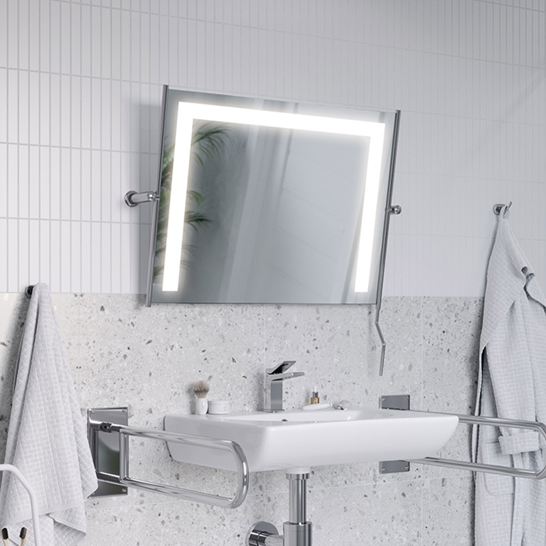 The Med ST Solea LED bathroom mirror from RUKE’s Med Line collection is a model designed with the comfort of people with disabilities in mind. Thanks to its suitable design and comfortable handle, it is possible to adjust the setting to individual needs by people with mobility or upper limb motility problems. The Med ST Solea LED tilt mirror for the disabled by RUKE was created with steel elements and a high-quality mirror panel.