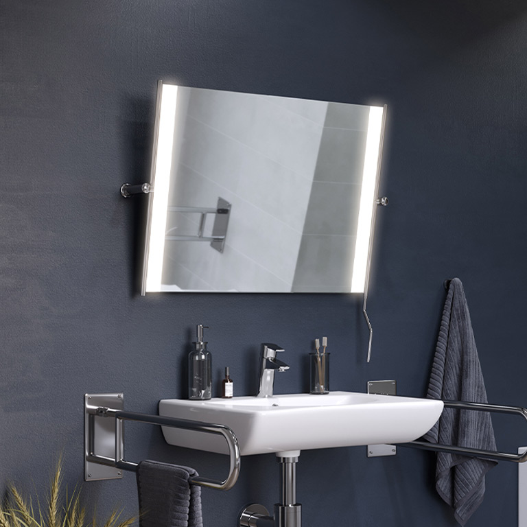 De Med ST kantelbare badkamerspiegel LED Dolino uit de Med Line collectie van RUKE is een model dat is ontworpen voor het comfort van mensen met een handicap. Dankzij het aangepaste ontwerp en de comfortabele handgreep is het mogelijk om de instelling aan te passen aan de individuele behoeften van mensen met mobiliteits- of bewegingsproblemen van de bovenste ledematen. De Med ST kantelbare spiegel LED Dolino van RUKE is gemaakt van stalen onderdelen en een spiegelpaneel van hoge kwaliteit.