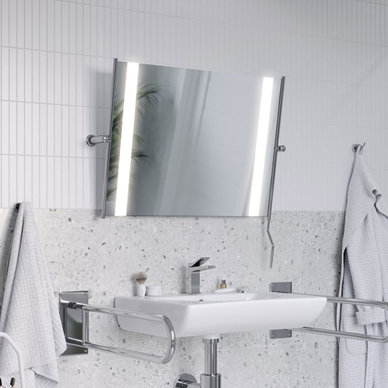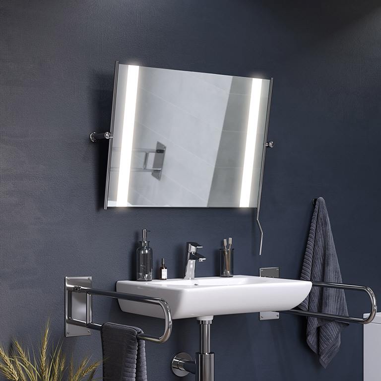 De Med ST badkamerspiegel LED Panorama uit de Med Line collectie van RUKE is een model dat is ontworpen voor het comfort van mensen met een handicap. Dankzij het aangepaste ontwerp en de comfortabele handgreep is het mogelijk om de instelling aan te passen aan de individuele behoeften van mensen met mobiliteitsproblemen of motorische problemen met de bovenste ledematen. De Med ST Panorama LED kantelbare spiegel voor mensen met een handicap van RUKE is gemaakt met stalen onderdelen en een spiegelpaneel van hoge kwaliteit.