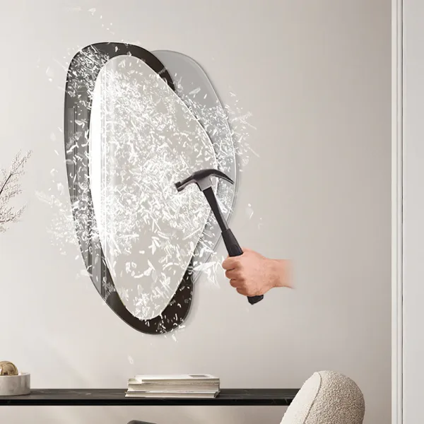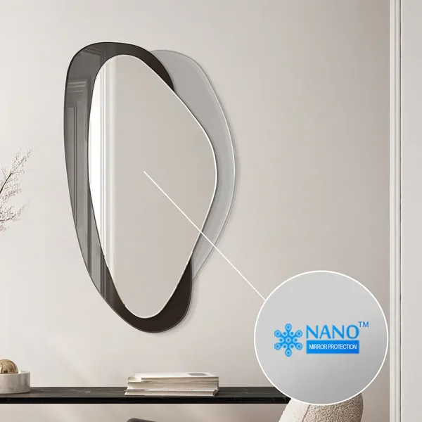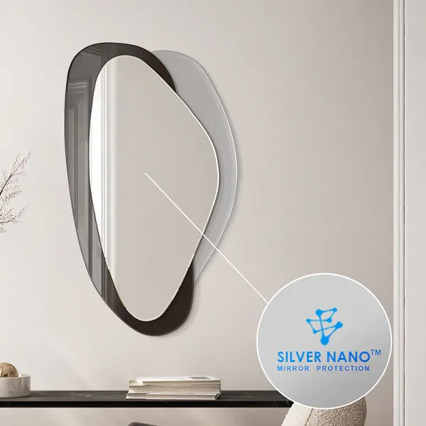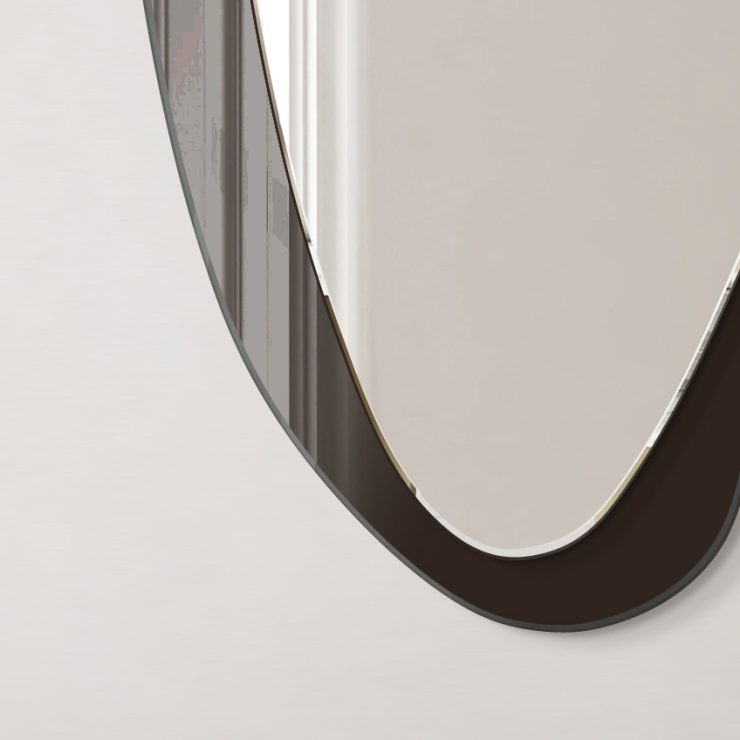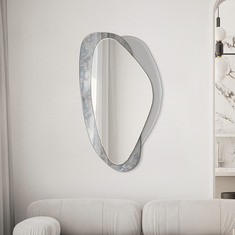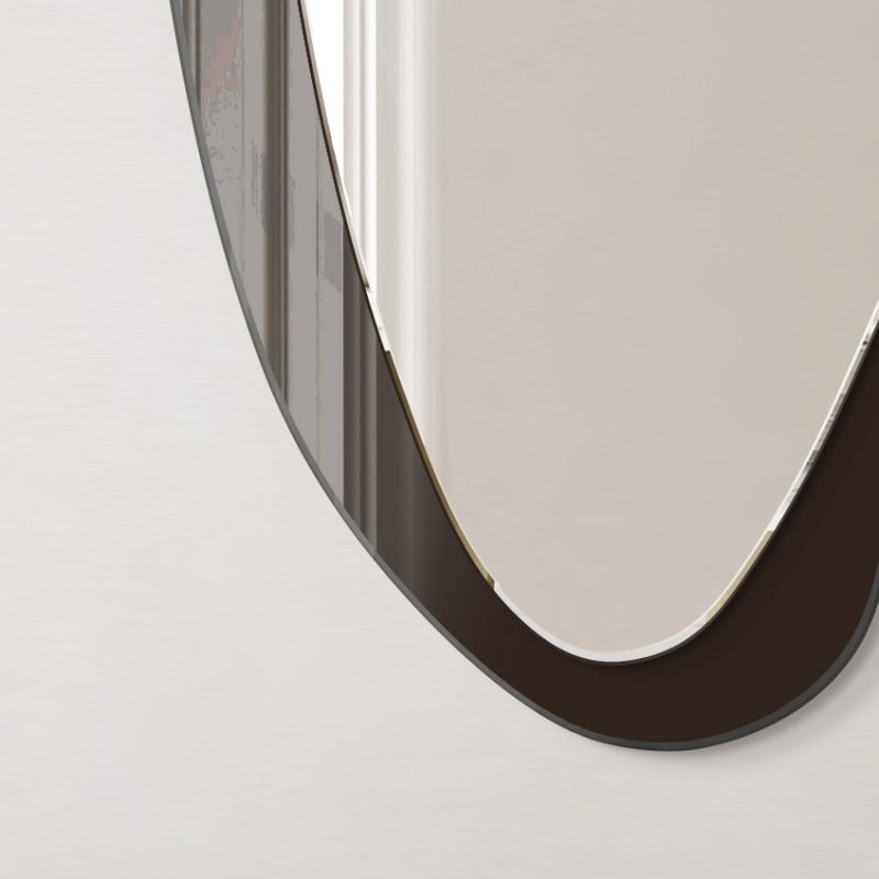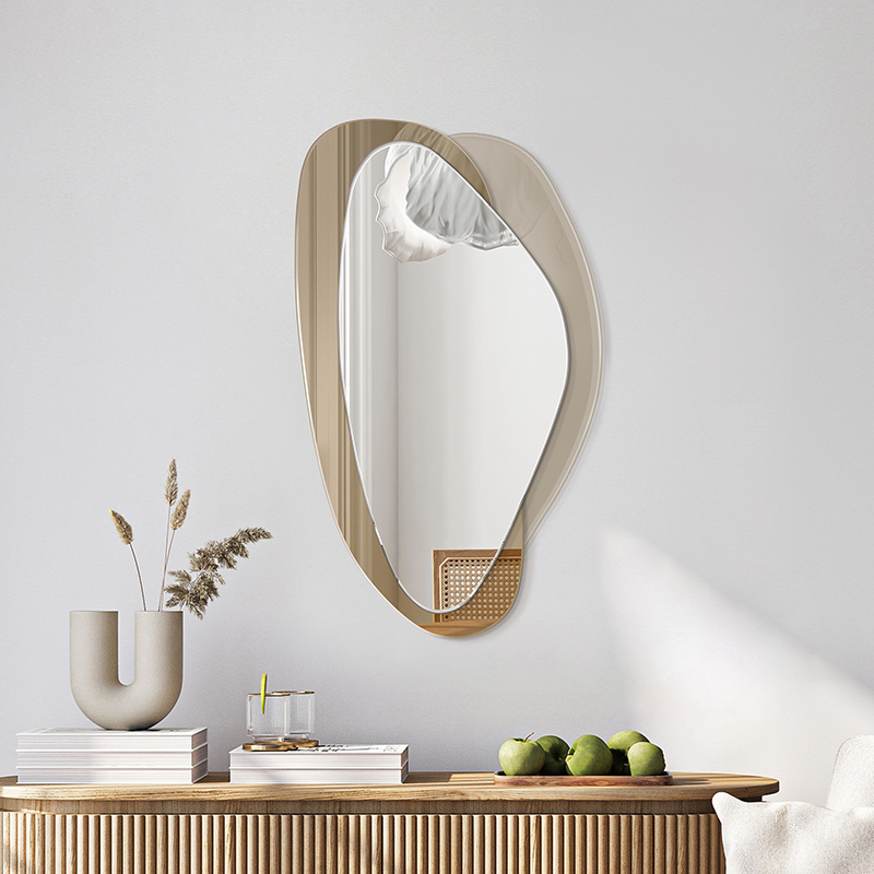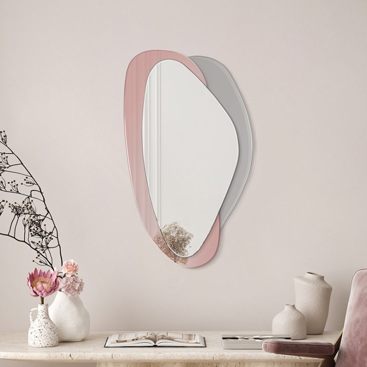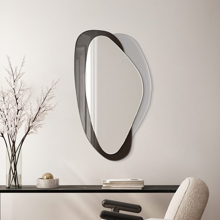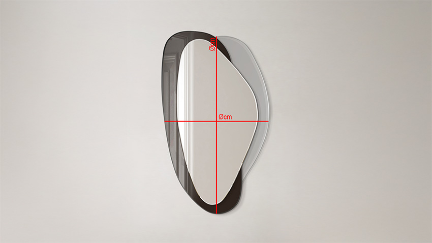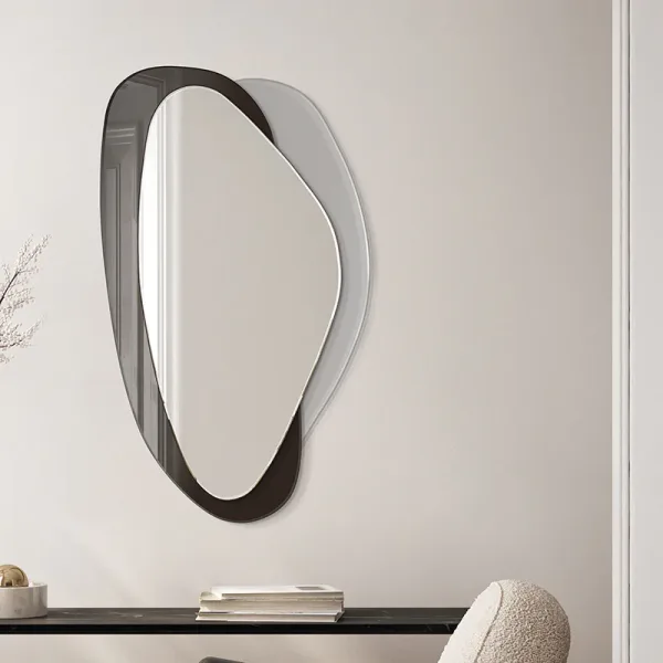 Deze moderne spiegel heeft een organische vorm en een elegante esthetiek. Met twee afgeronde ruiten en een asymmetrisch frame past hij perfect in verschillende stijlen. Hij is verkrijgbaar in vier kleuren: zwart, zilver, brons en grijs en is perfect voor de woonkamer, hal, slaapkamer en badkamer, omdat hij de ruimte optisch vergroot.