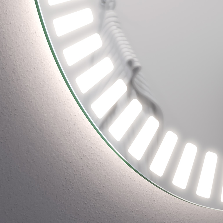 Nauwkeurige make-up met LED-spiegel. Het voordeel van het Hyperion model is de grote hoeveelheid licht die wordt gegenereerd. Een 4 cm brede LED-strip met melkachtig profiel is rond de hele omtrek van de spiegel gemonteerd. Hierdoor kun je je gezicht perfect verlichten, waardoor je details kunt zien die met een gewone lamp onzichtbaar zijn.