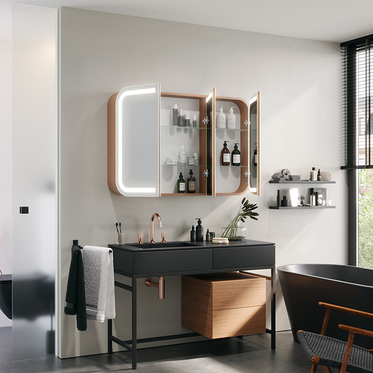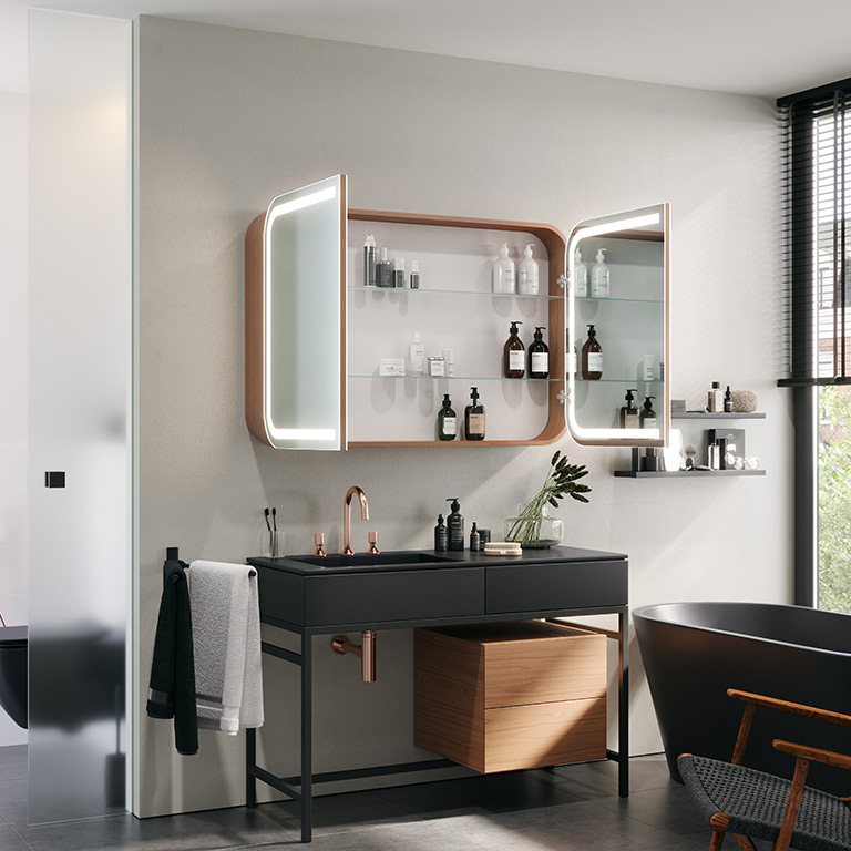 Het model Bolivia is ontworpen om de ruimte in je badkamer beter te benutten. Het combineert een ruime kast met een perfect ontworpen spiegel. De fronten van de kast zijn vervangen door een paneel waarin LED-verlichting is geïntegreerd. Het geeft een sterk maar aangenaam licht. Dit maakt het aanbrengen van make-up gemakkelijker en preciezer. Het praktische kastje boven de wastafel biedt ruimte aan je belangrijkste beautyproducten. Zo heb je ze altijd bij de hand en is de ruimte rond de wastafel netjes en opgeruimd. Om dit meubelstuk nog meer naar jouw smaak te maken, maken we het op maat.