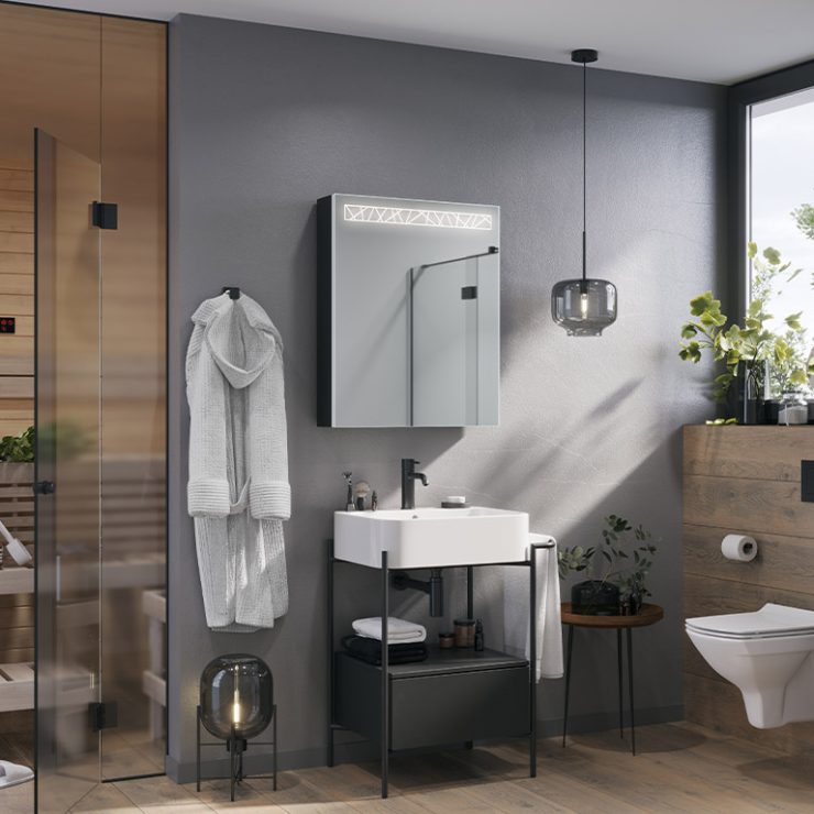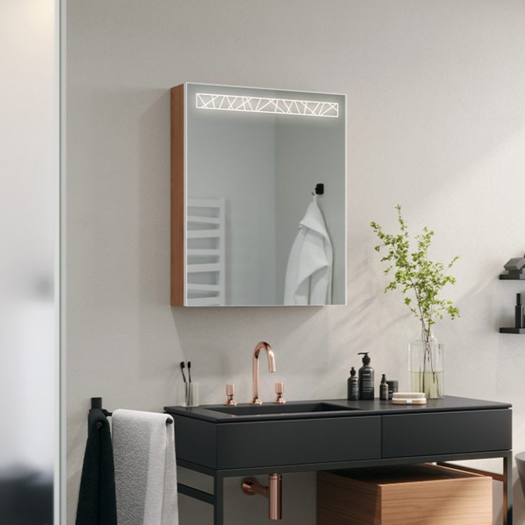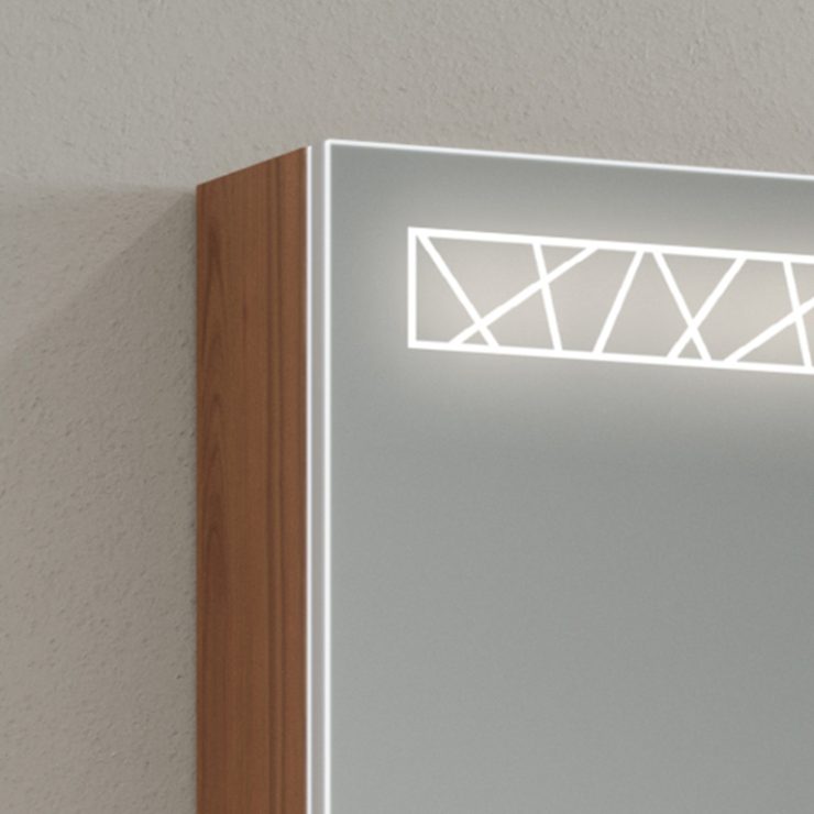 De slanke vorm van de LED-spiegel en het minimalistische silhouet van de kast zorgen ervoor dat deze zowel in een klassiek als modern interieur past. Dankzij het brede kleurengamma kun je de kast afstemmen op de rest van je inrichting en je badkamer inrichten zoals jij dat wilt. Een geïntegreerde LED-strip aan weerszijden van het spiegelpaneel verspreidt het licht gelijkmatig. Hierdoor wordt je gezicht precies verlicht tijdens je dagelijkse wasbeurt en krijgt je badkamer een warme sfeer. Op individueel verzoek voegen we binnenverlichting toe, zodat je de inhoud van de kast zelfs in het donker kunt zien.