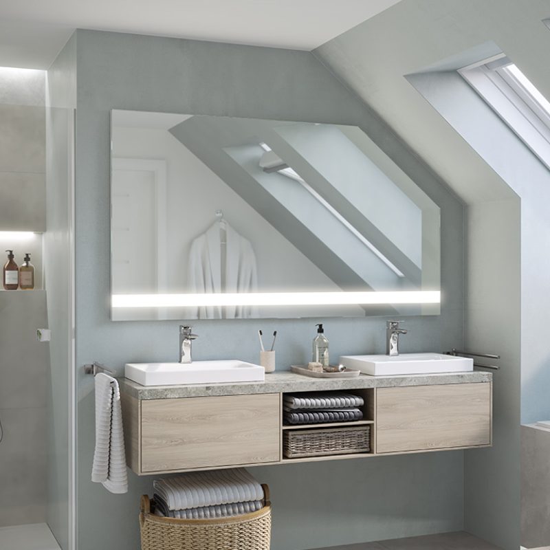 Moderne LED spiegels, op maat gemaakt voor de schuine badkamermuur, zijn een effectieve manier om moeilijke zolderruimtes in te richten.