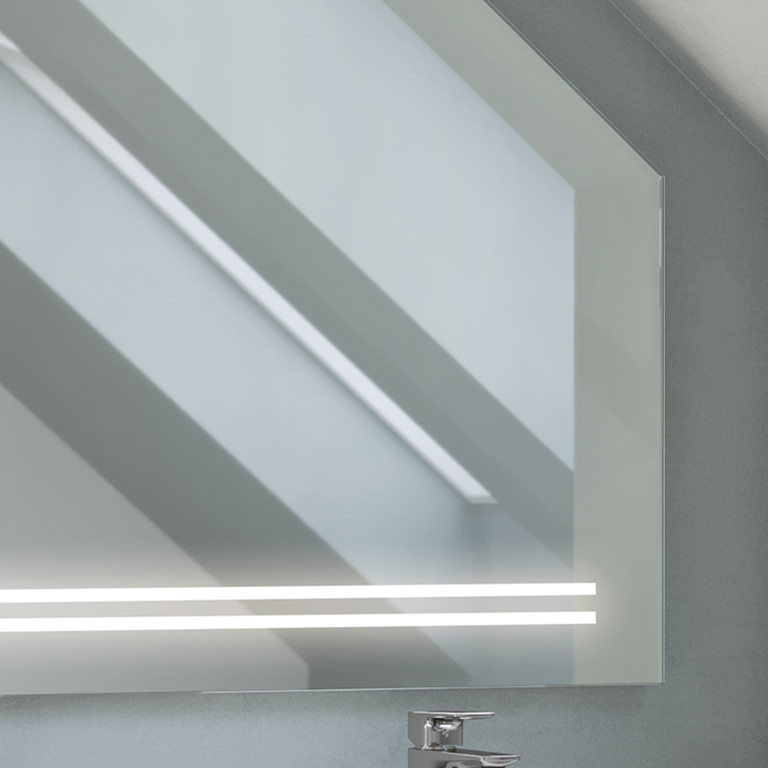 Moderne LED spiegels, op maat gemaakt voor de schuine badkamermuur, zijn een effectieve manier om moeilijke zolderruimtes in te richten.