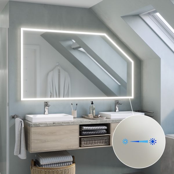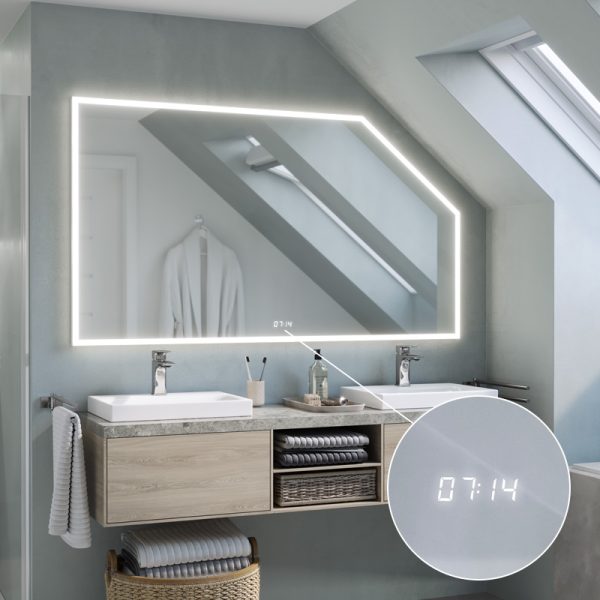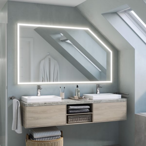 De Paolo LED Slim spiegel met zijn onregelmatige randen is de ideale keuze voor een zolderbadkamer, waar de schuine kanten het onmogelijk maken om modellen met traditionele vormen te installeren. Bekijk ons assortiment en bestel het product in de maat van je keuze.